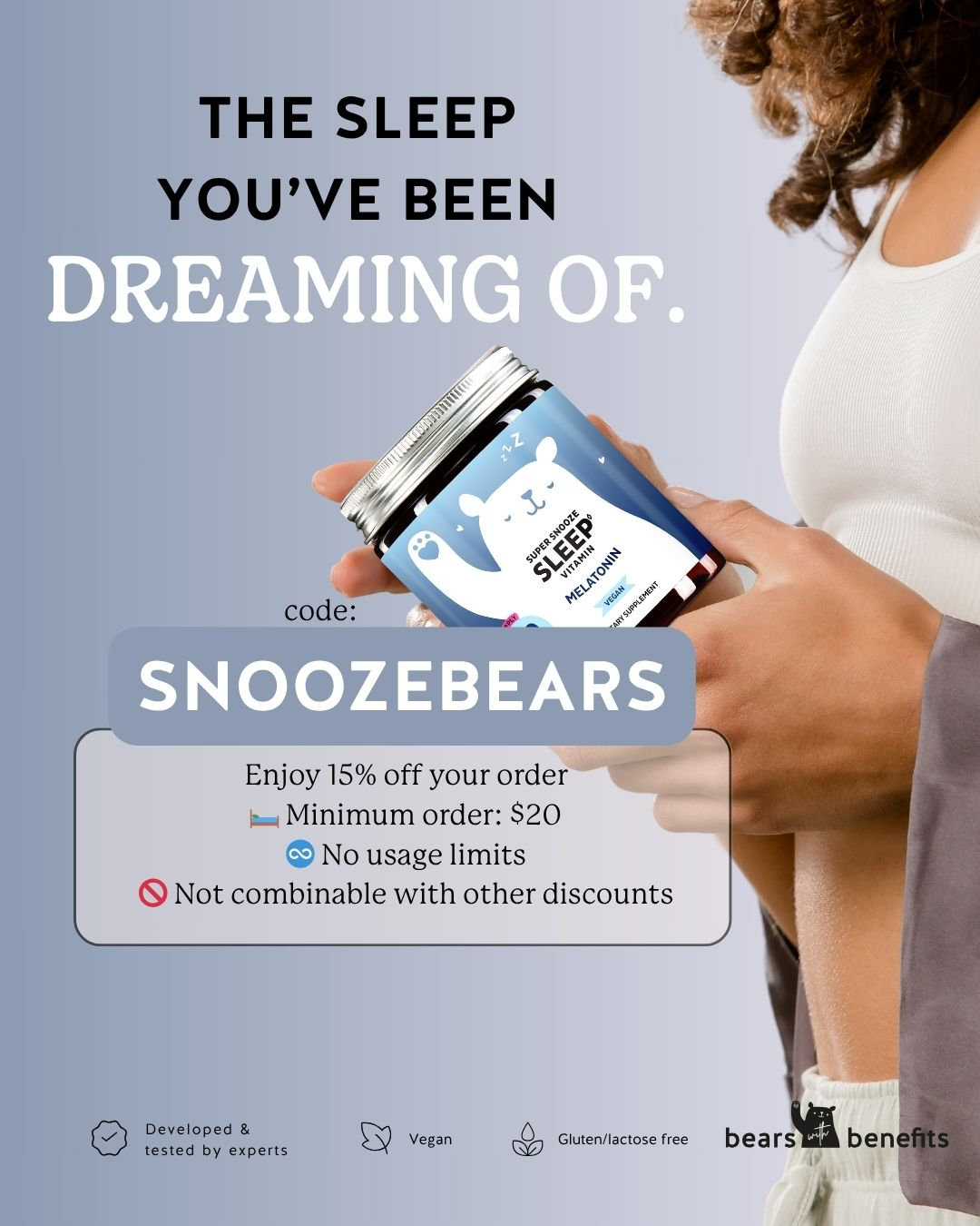 Explore other dreamy wellness deals on the official store page and discover Bears with Benefits’ bestselling gummy ranges for hair, mood, PMS relief, immunity, and more.